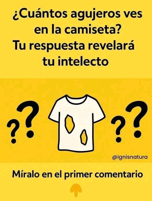 ¿Cuántos agujeros tiene esta camiseta?De acuerdo a varias páginas, 1 de cada 7 adultos da con la respuesta correcta en el primer intento, así que daremos algunas opciones para ver si lo consiguen más fácilmente. ¡Aquí vamos!